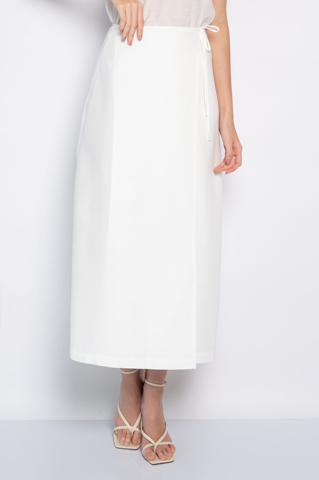 A saia midi transpassada amarração botão combina com camisas leves, blusas ajustadas ou tops cropped, compondo looks versáteis.
