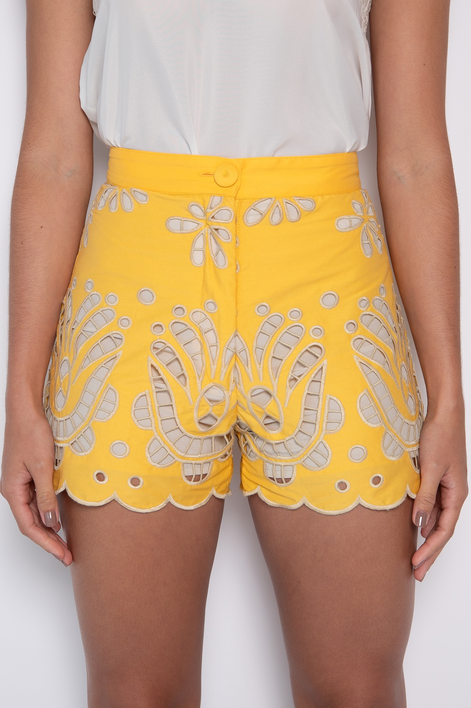 Com fechamento frontal por botão e zíper, o short curto bordado vazado com matame oferece praticidade e elegância. Esse tipo de fechamento facilita o vestir, além de reforçar o ajuste perfeito ao corpo.