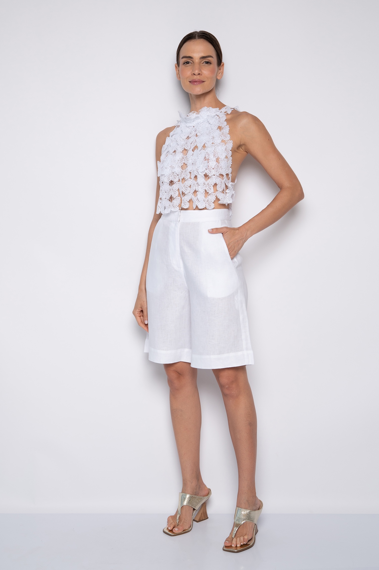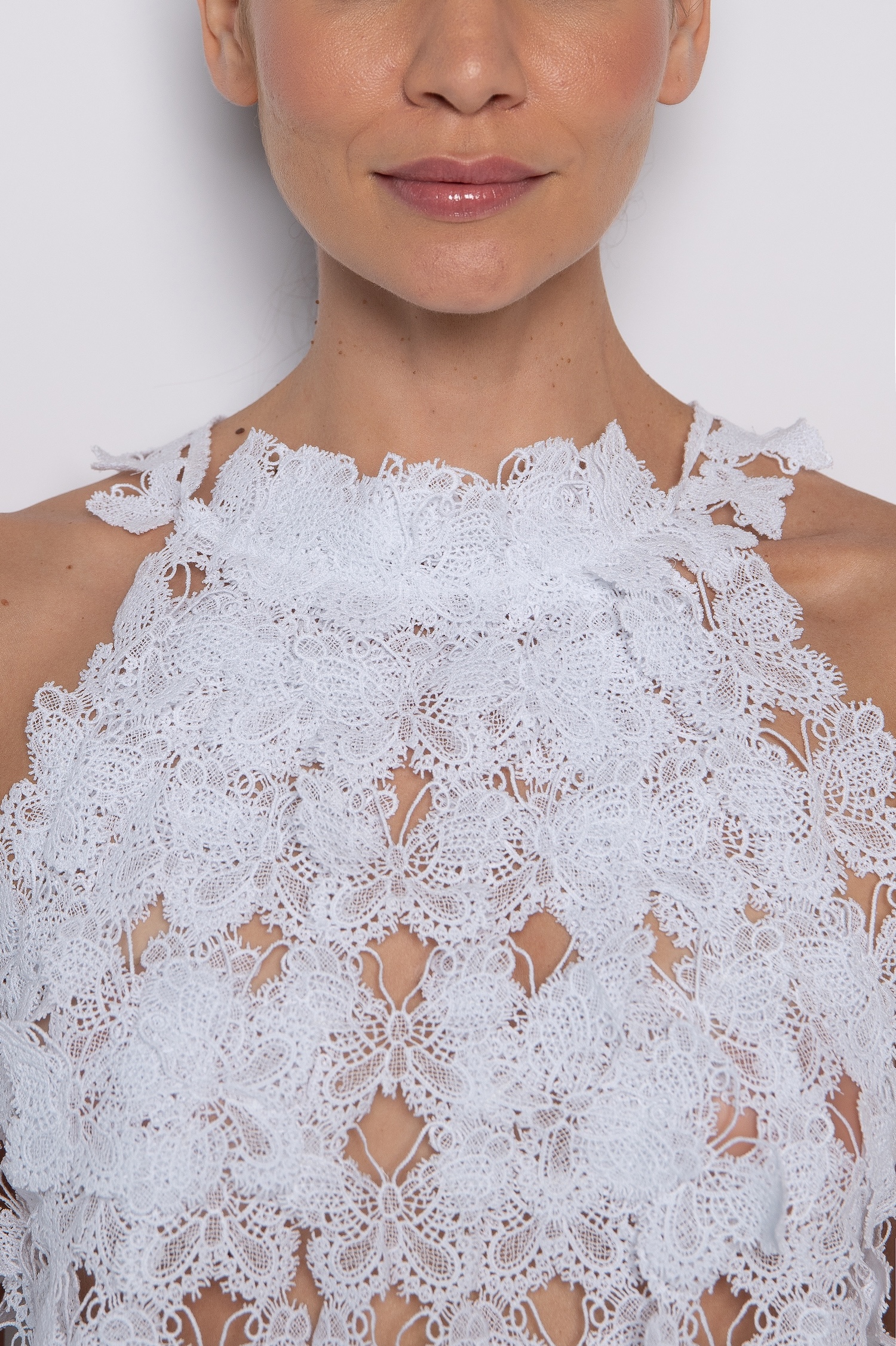 A entretela solúvel cria base perfeita para bordados complexos, e após dissolvida, deixa o top extremamente leve. Assim, o toque fica suave contra a pele, o que aumenta o conforto durante longos períodos de uso. Além disso, a construção manual valoriza o trabalho artesanal, tornando cada peça única.