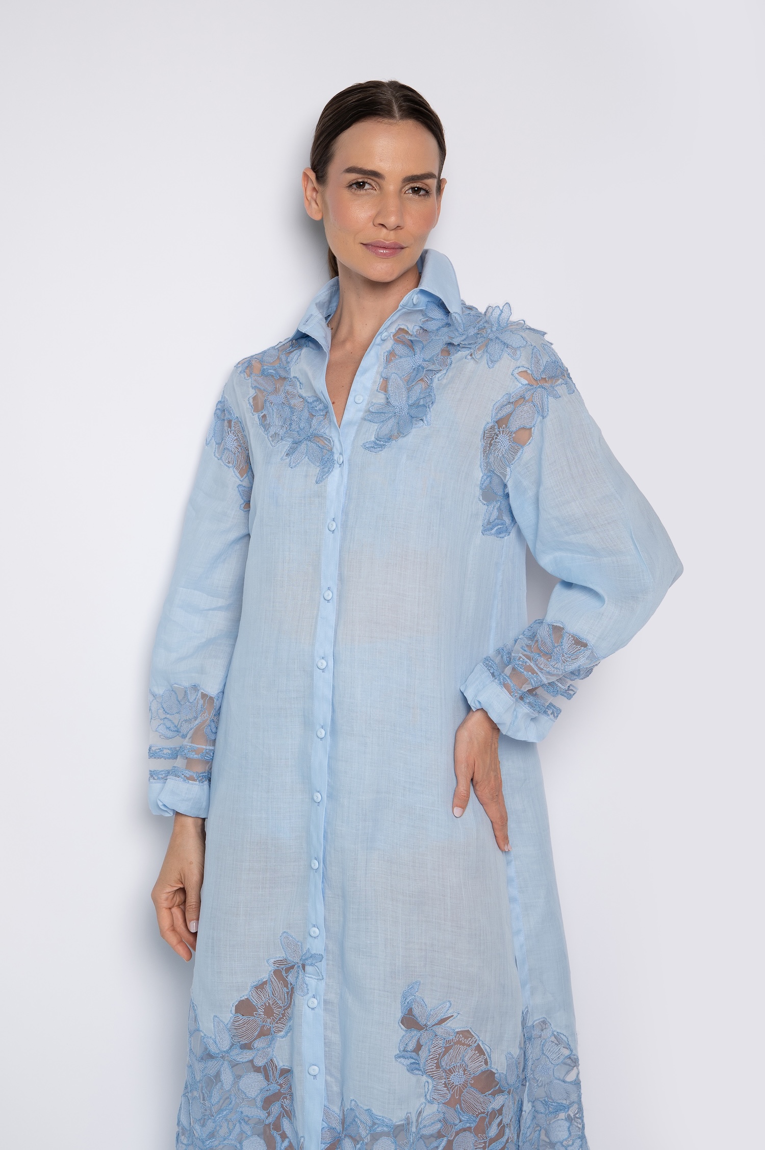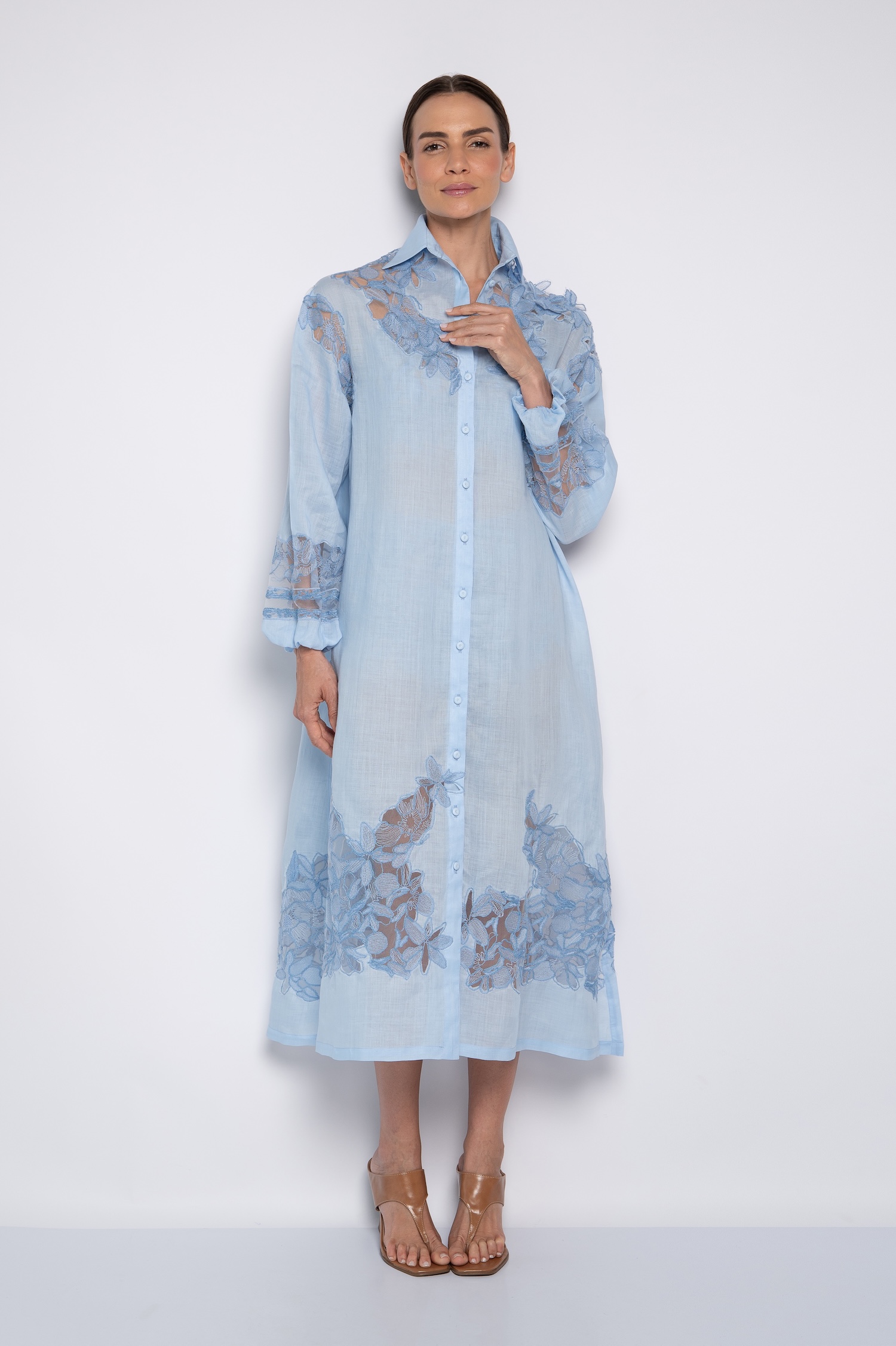 O vestido chemise bordado com manga 7/8 apresenta elegância moderna e já introduz sofisticação versátil para diferentes ocasiões do dia.