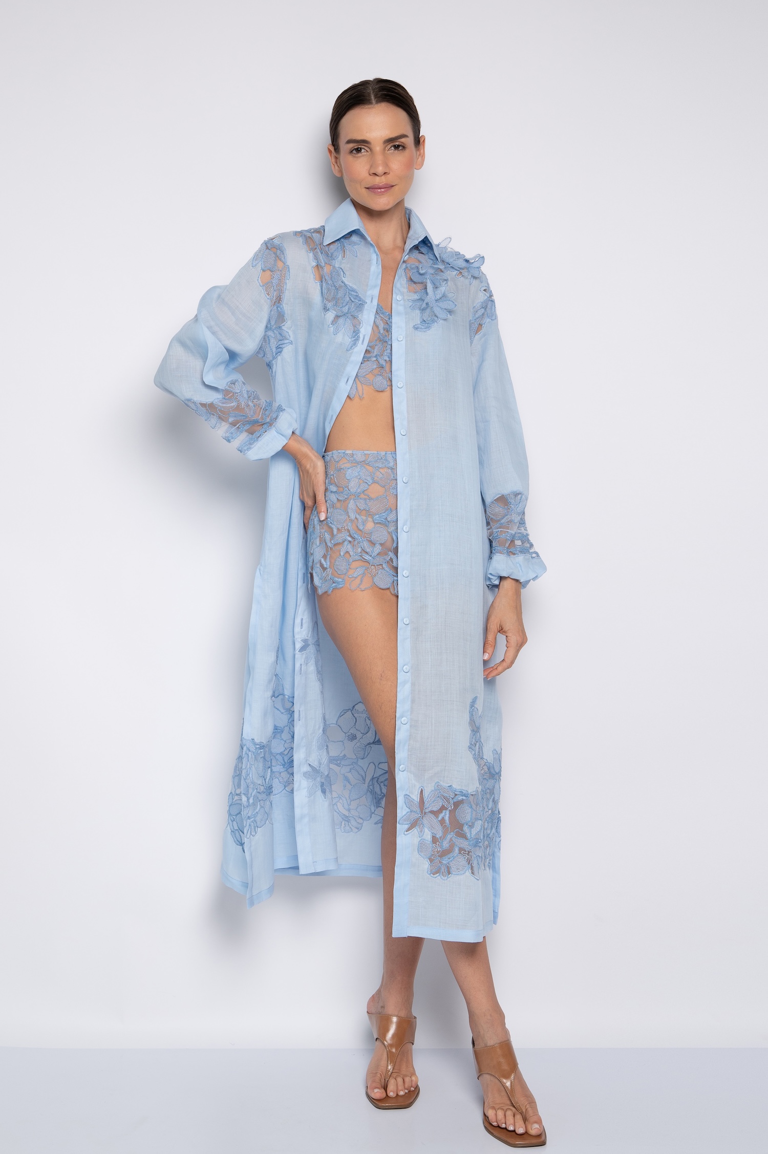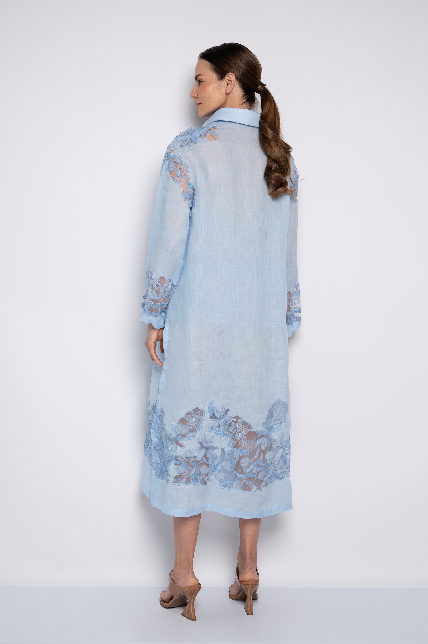 Vestido Chemise Bordado Com Manga 7/8 Azul – Adeline