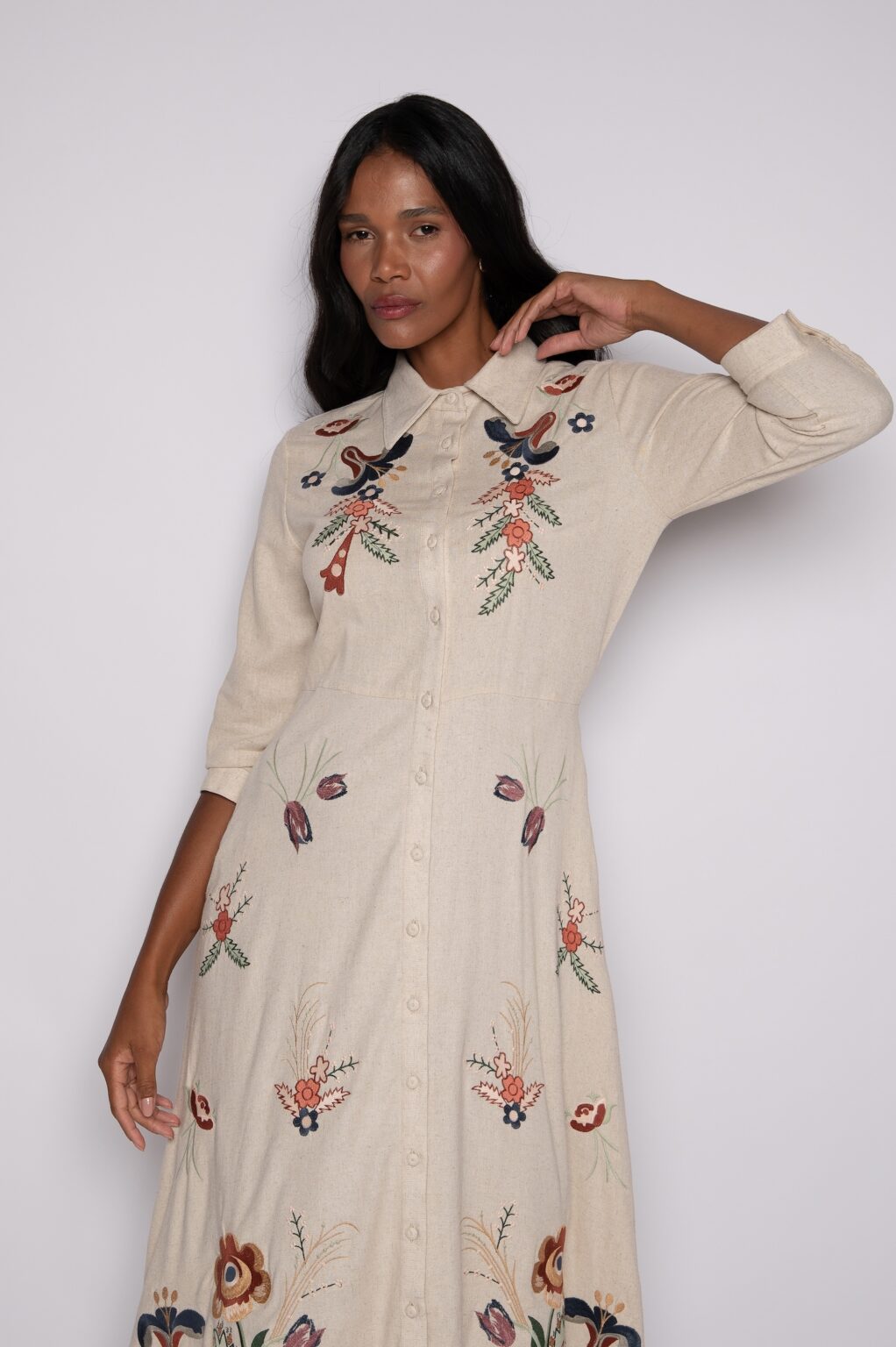 Vestido Chemise Bordado com Manga 3/4 Bege – Vânia