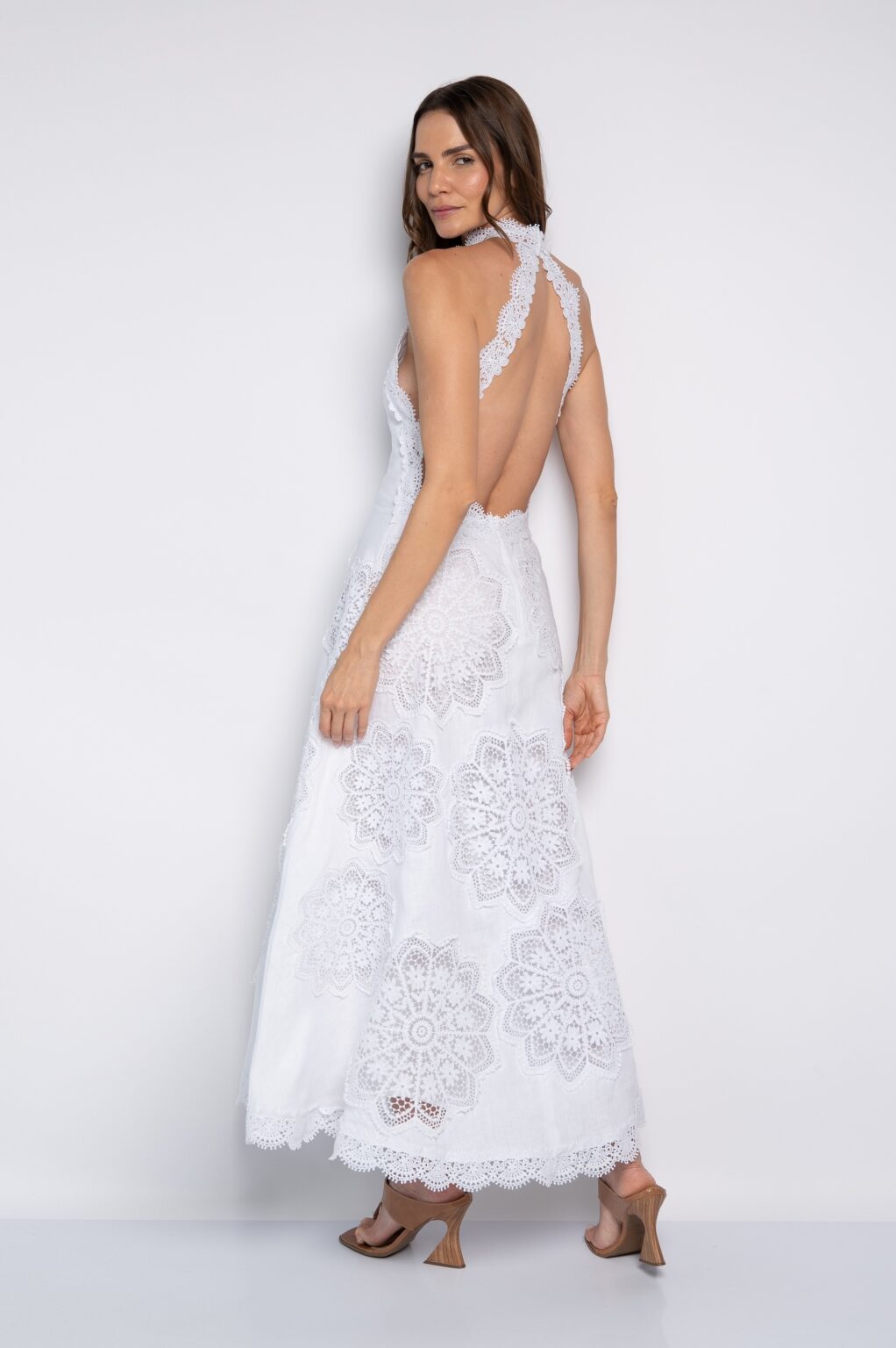 Vestido Longo Bordado com Gola Alta e Costas Nuas Branco – Alcione