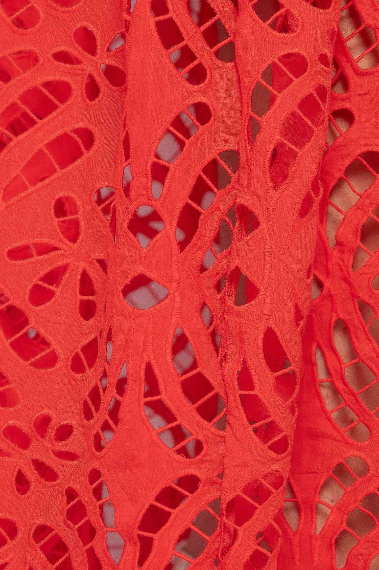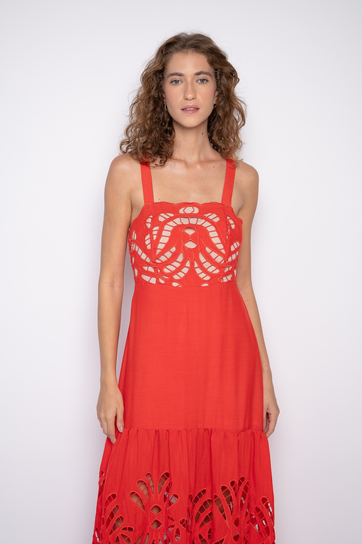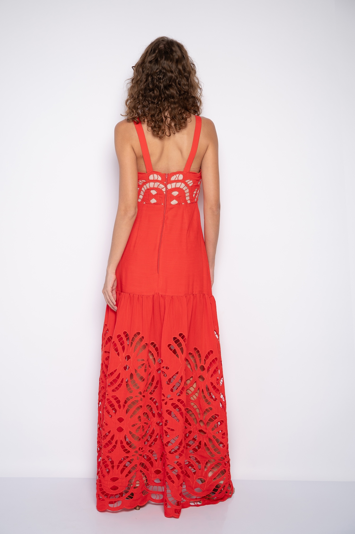 Vestido Longo Bordado Com Decote Quadrado Vermelho – Tereza