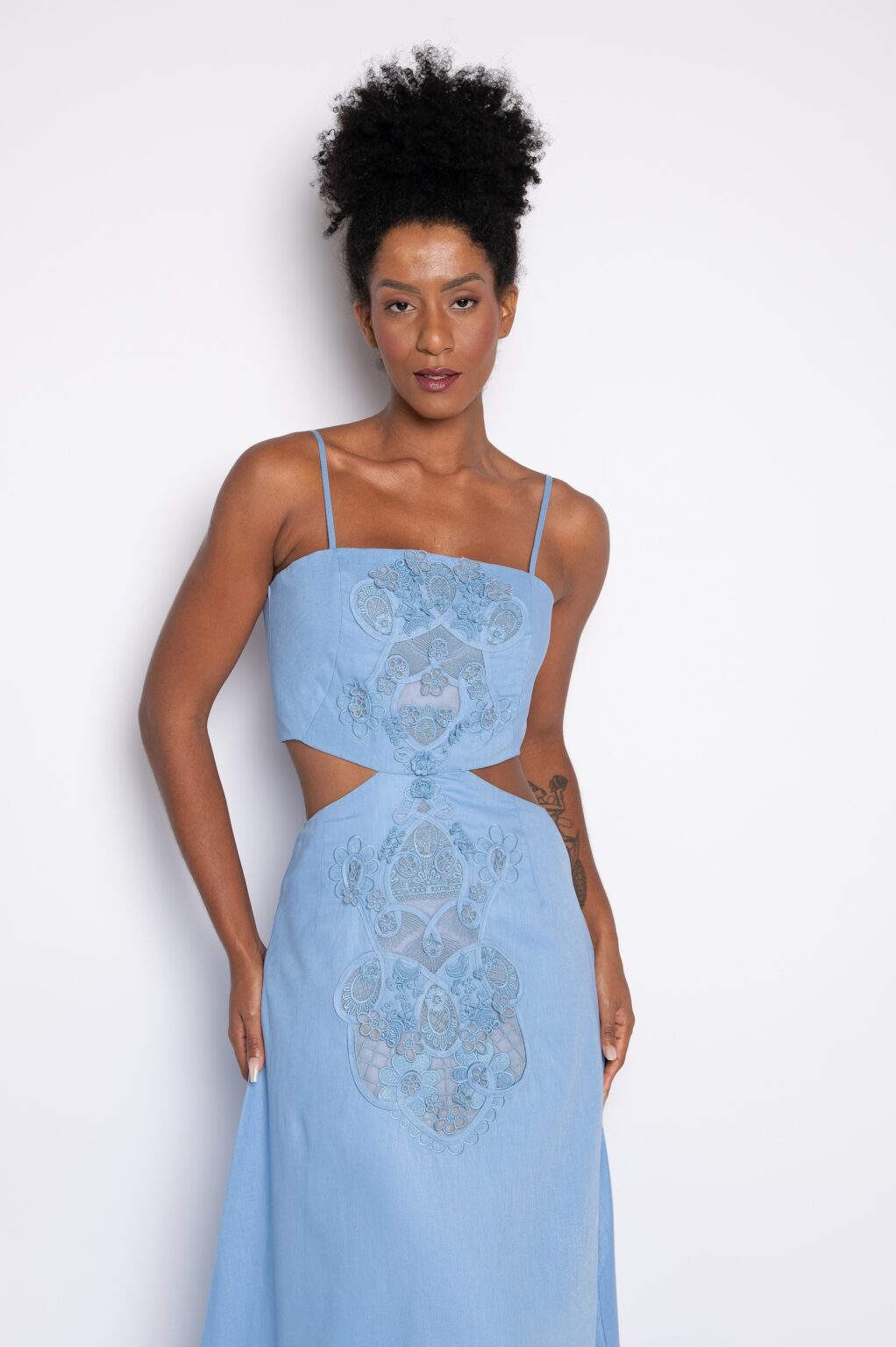 O vestido longo bordado com transparência tule possui recortes vazados nas laterais. Esses recortes criam um contraste moderno e equilibrado com a fluidez da saia evasê.