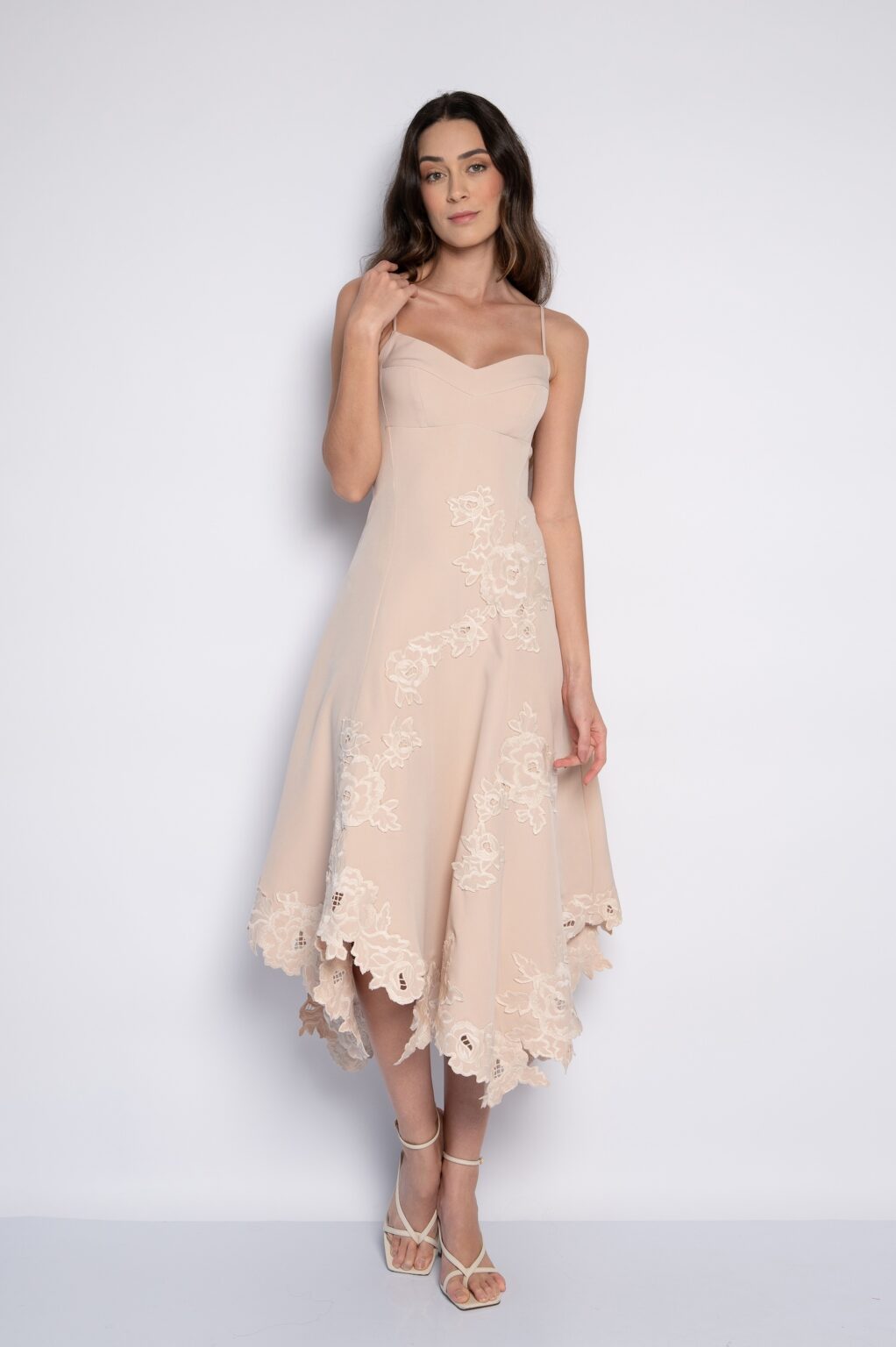 Vestido midi bordado com flores e barra assimétrica Bege – Josy