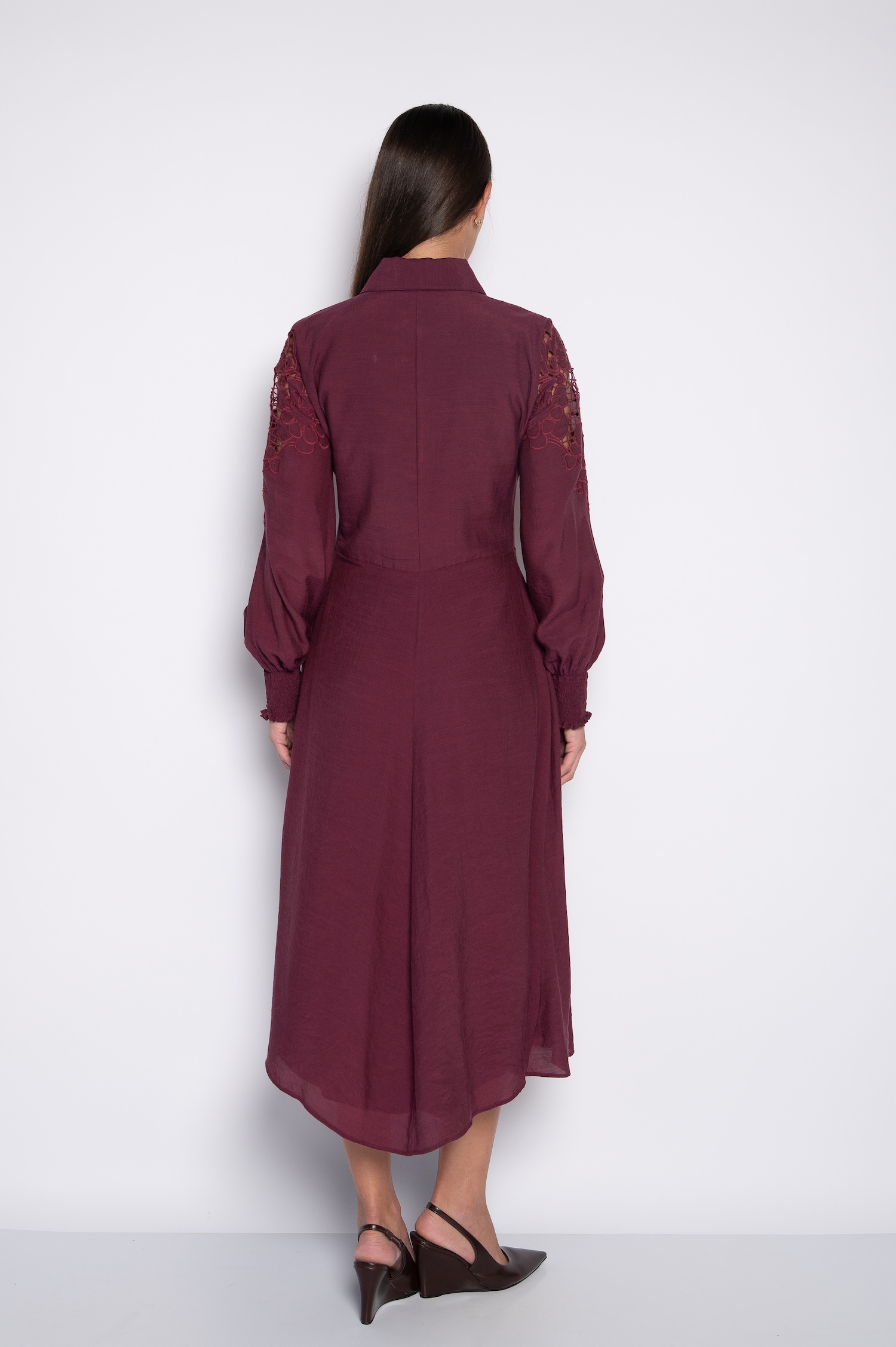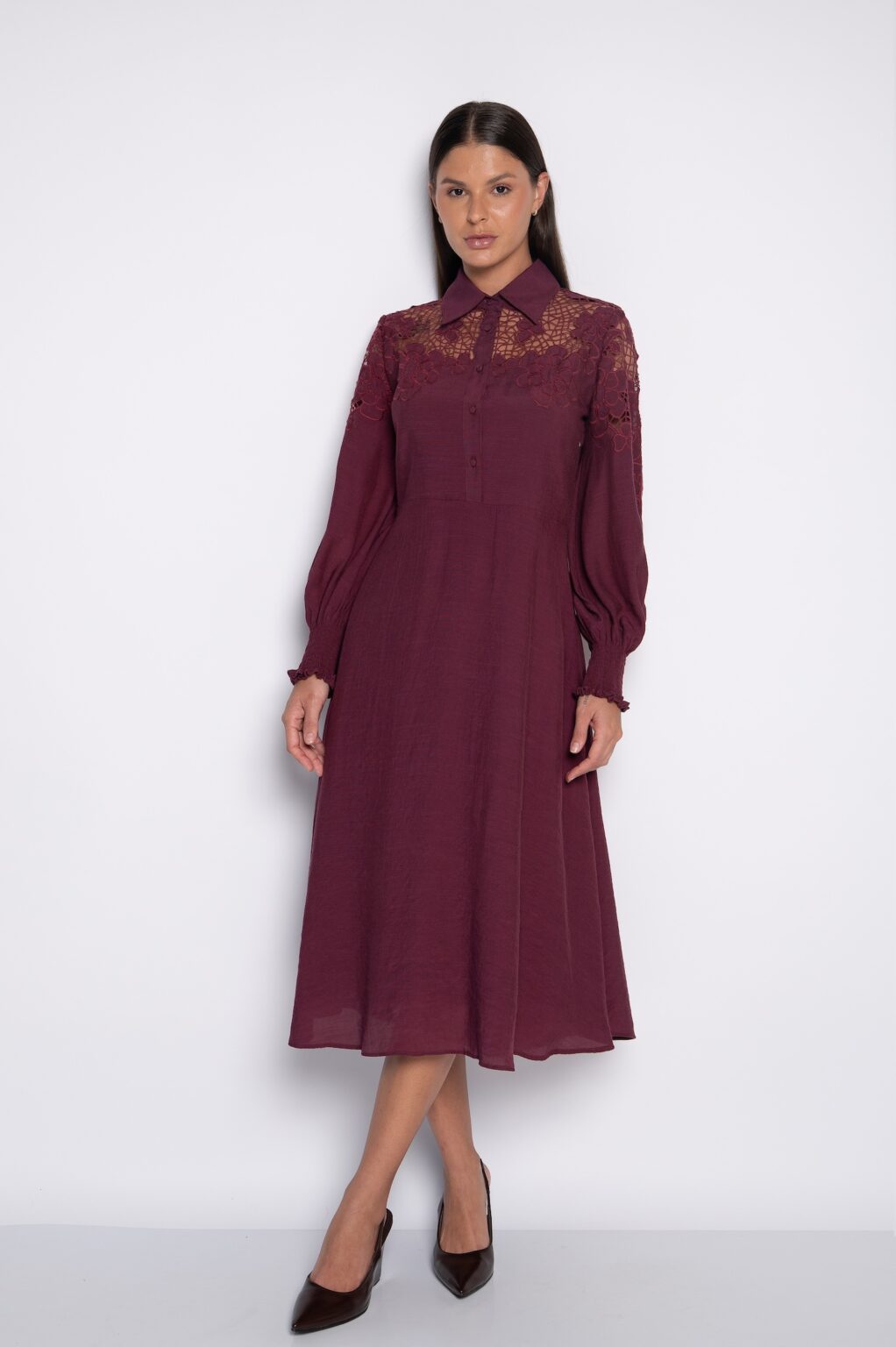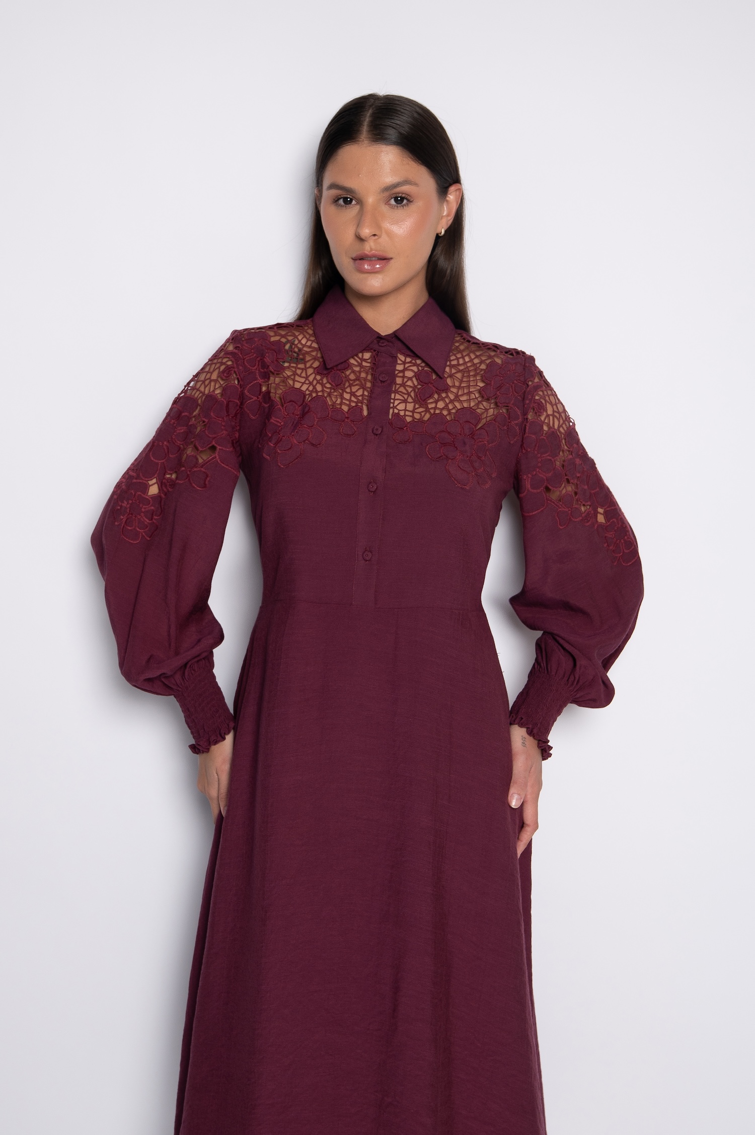 Vestido Midi Bordado com Mangas Bufantes Vinho – Vanusa