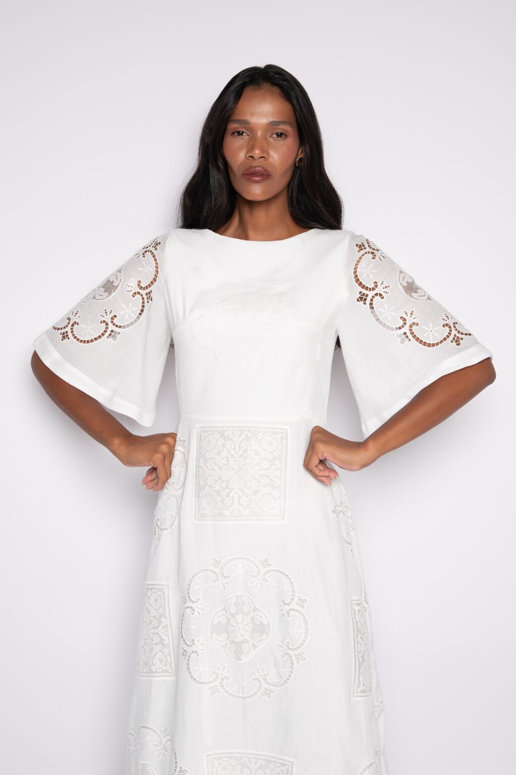 Primeiramente, o vestido midi bordado apresenta acabamento refinado e visual delicado.