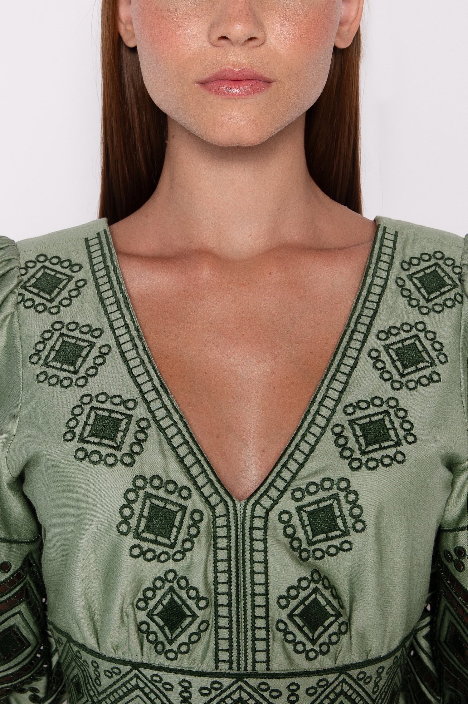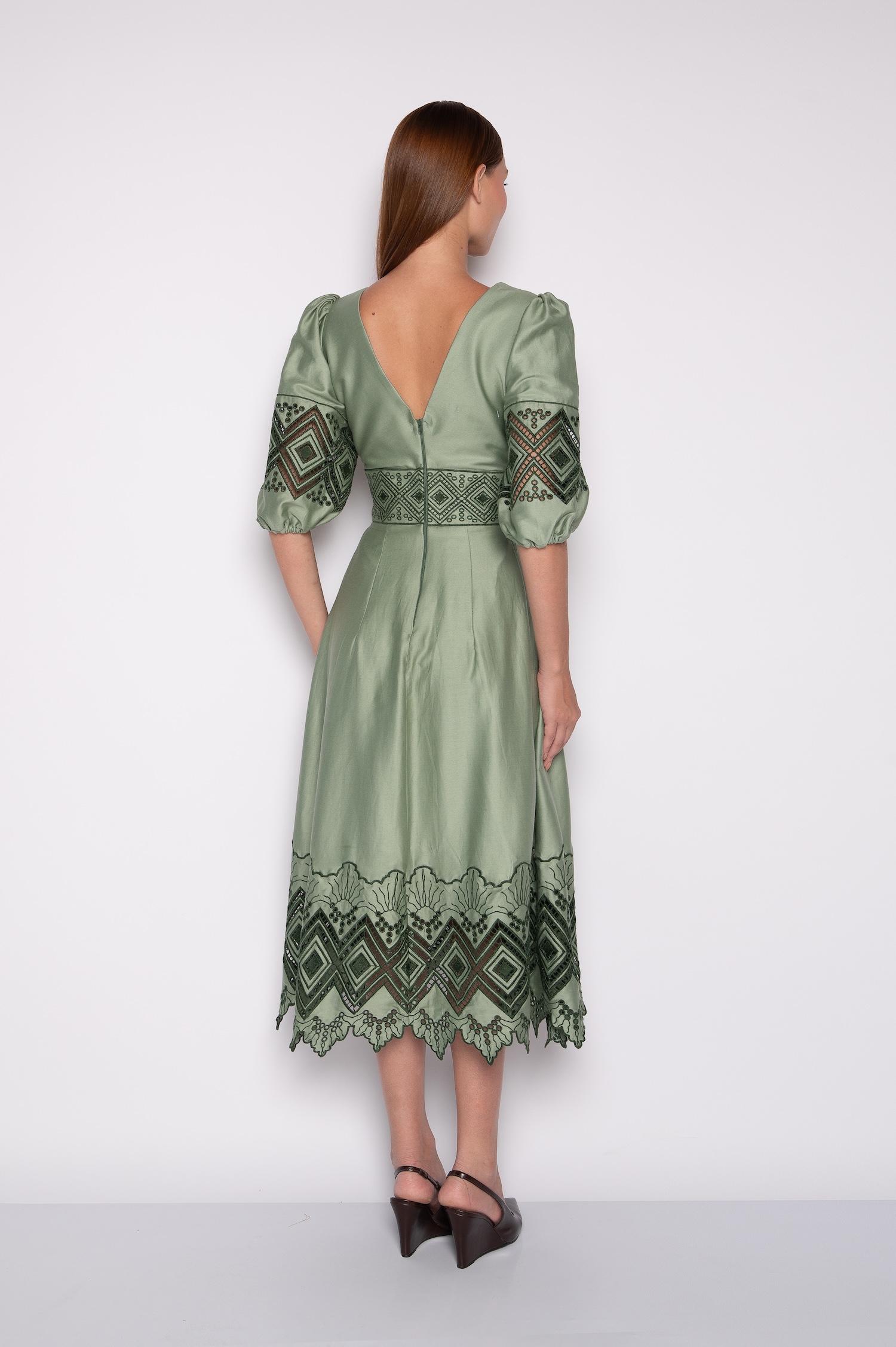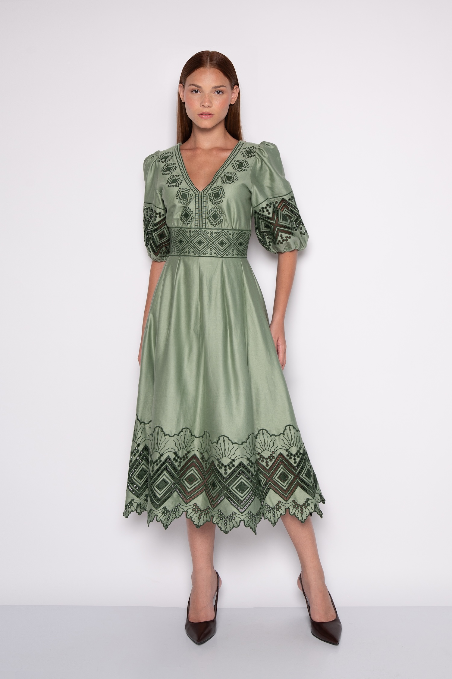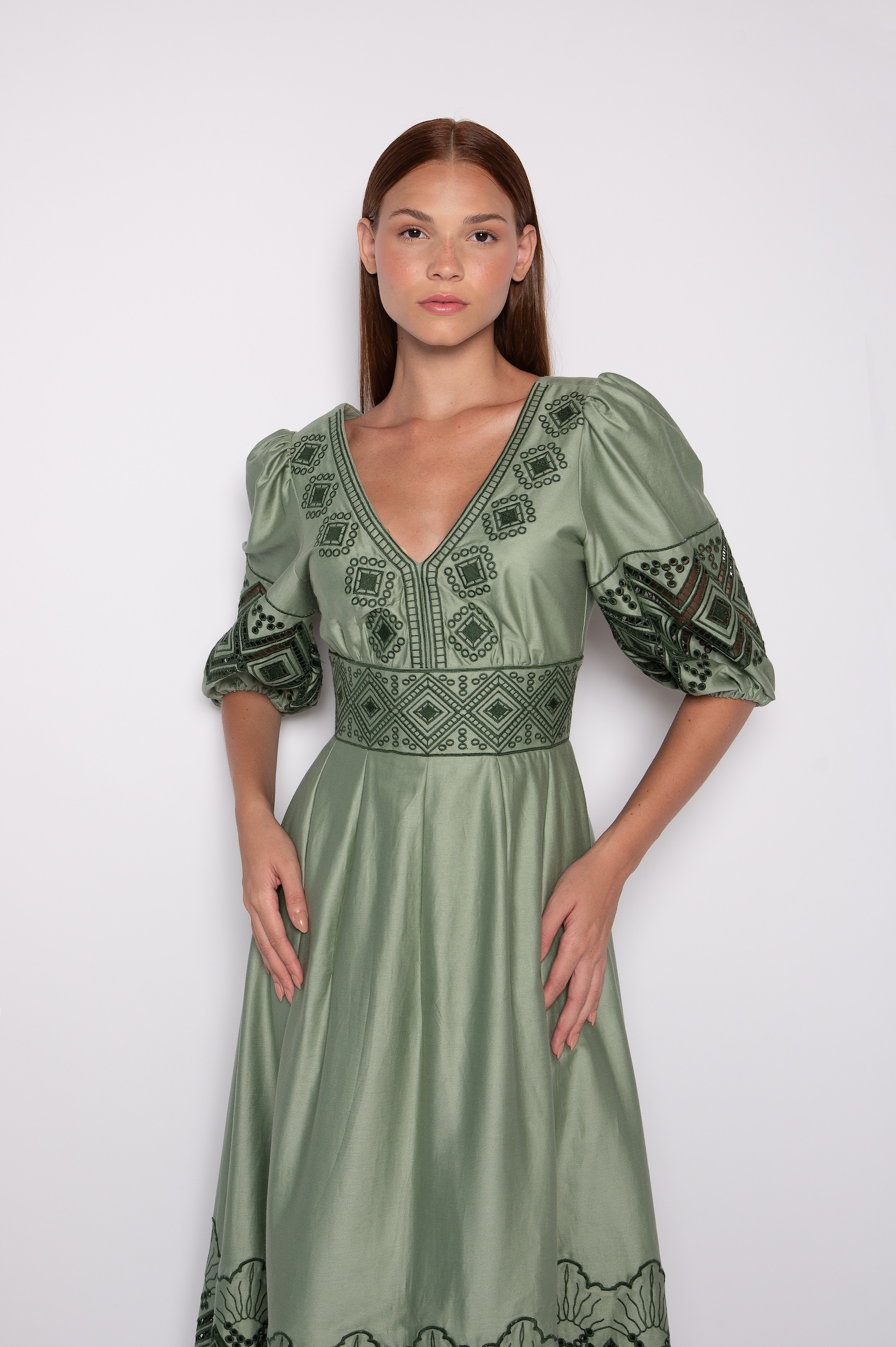 Vestido Midi Bordado Com Decote V e Mangas Bufantes Verde Claro – Gleice