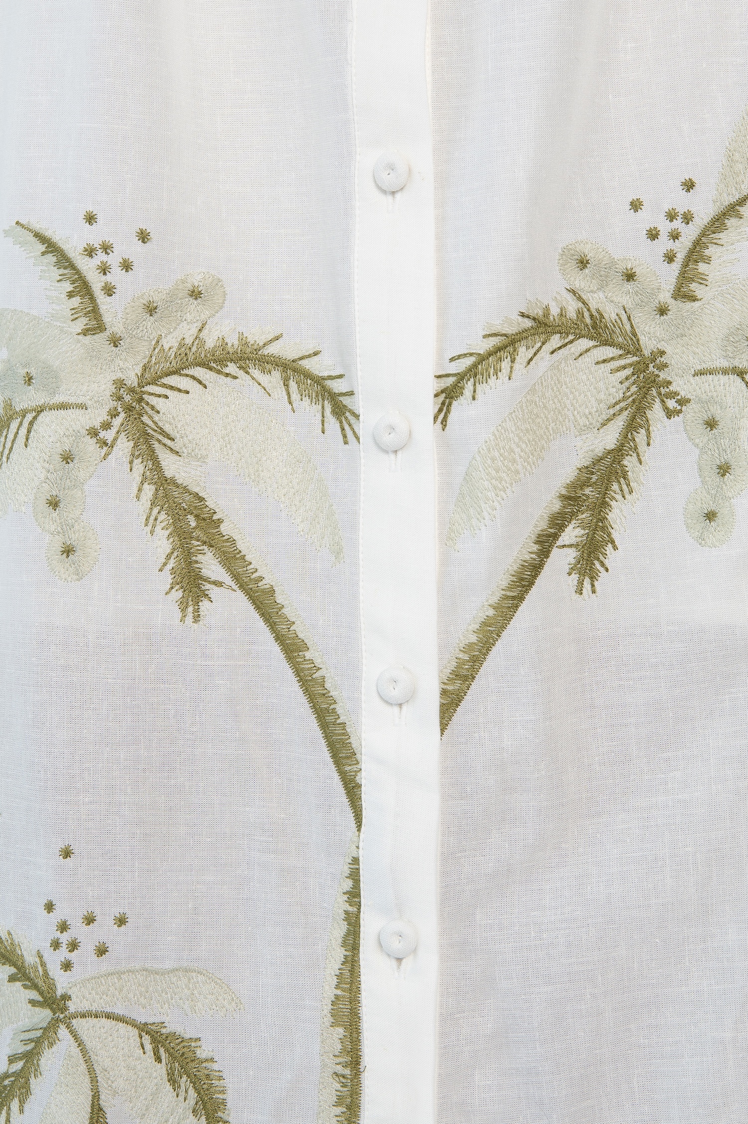 O abotoamento nas mangas complementa a construção e adiciona personalidade sutil. Portanto, cada detalhe contribui para uma estética coerente e sofisticada. O bordado frontal destaca o trabalho manual e reforça o caráter autoral do modelo. Além disso, o desenho bordado acrescenta delicadeza ao visual.
