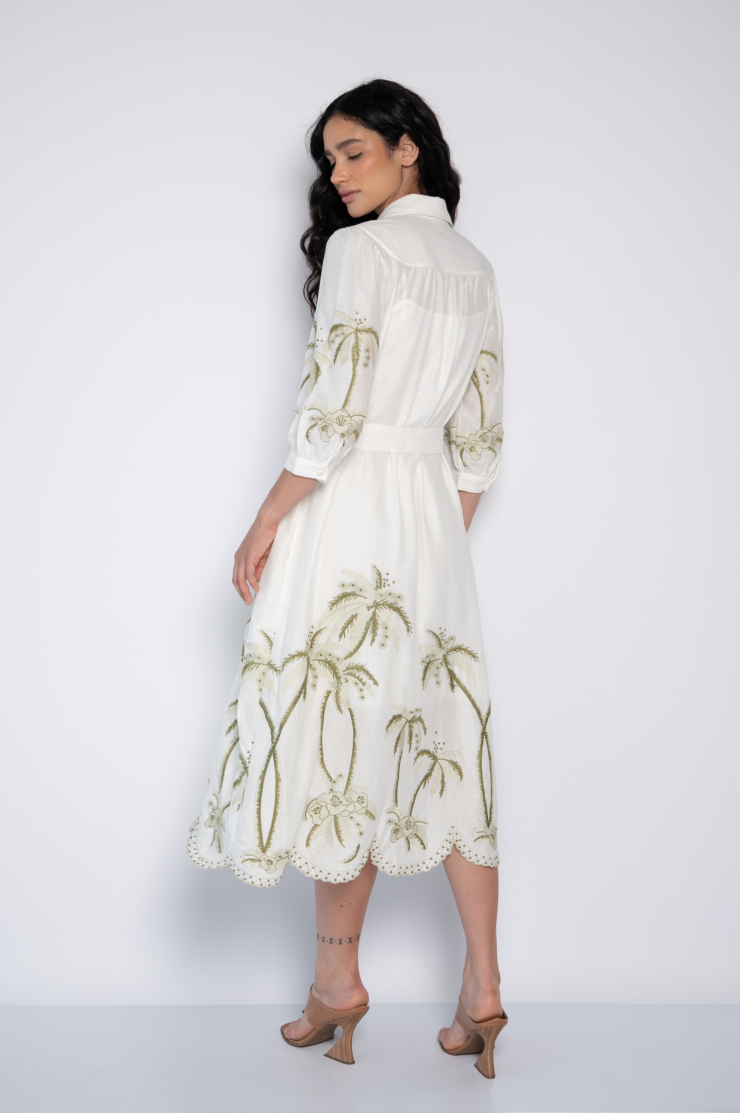 A gola tradicional, unida ao pé de gola, cria acabamento elegante e estruturado. Dessa forma, o vestido transmite postura elevada sem comprometer o conforto. O vestido midi bordado com manga 3/4 também apresenta abotoamento frontal funcional, oferecendo praticidade no vestir. Ainda assim, o detalhe mantém o estilo refinado da peça.