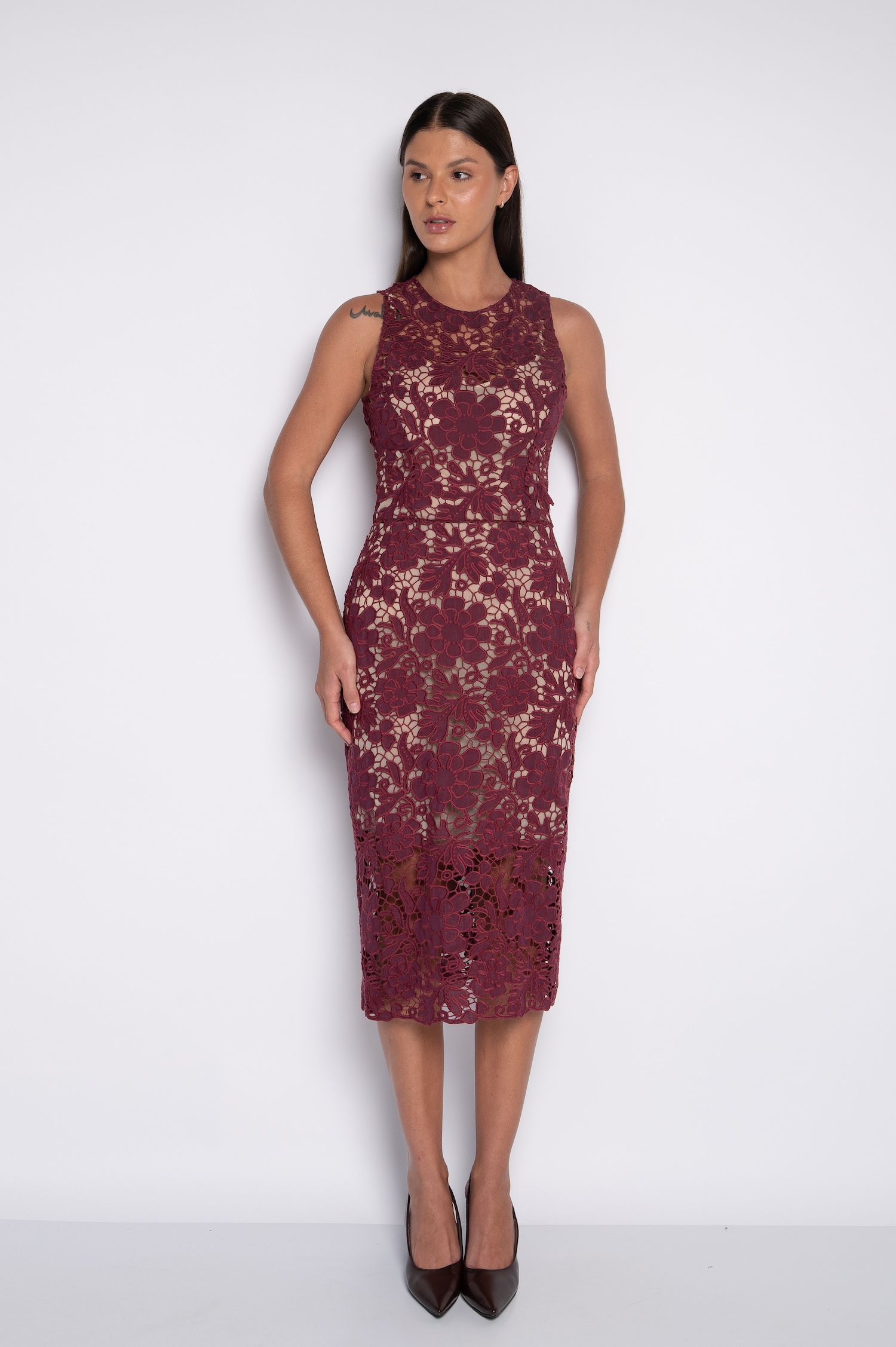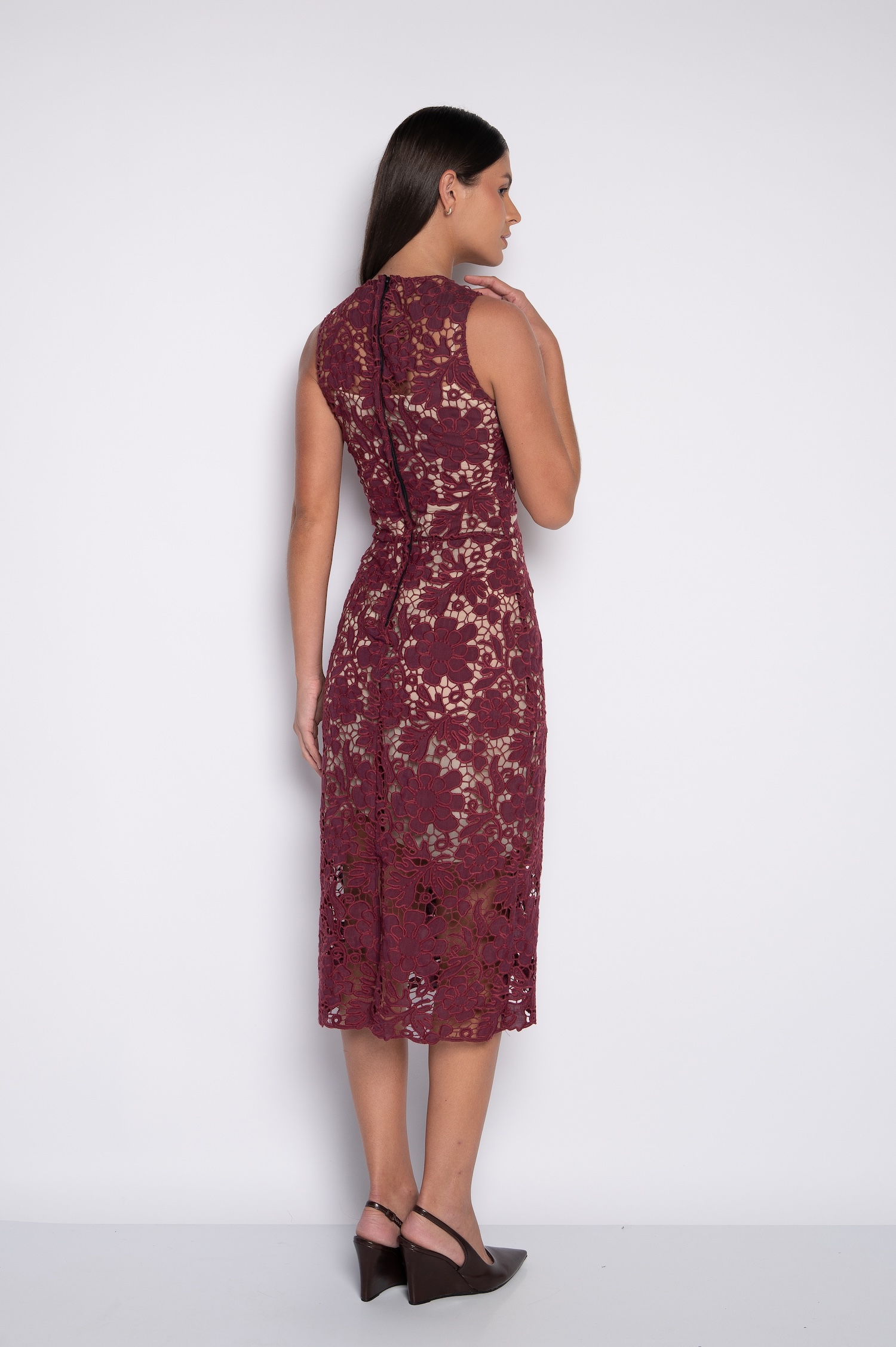 Vestido Midi Reto Bordado Cavado Vinho – Isadora